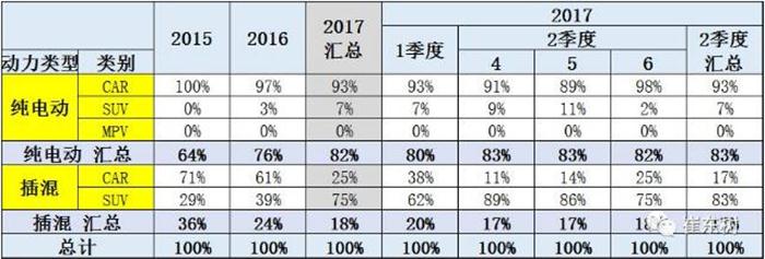 纯电动乘用车中基本是轿车产品,17年1-6月的插混SUV逐步增多,这也是新能源产品升级的体现。